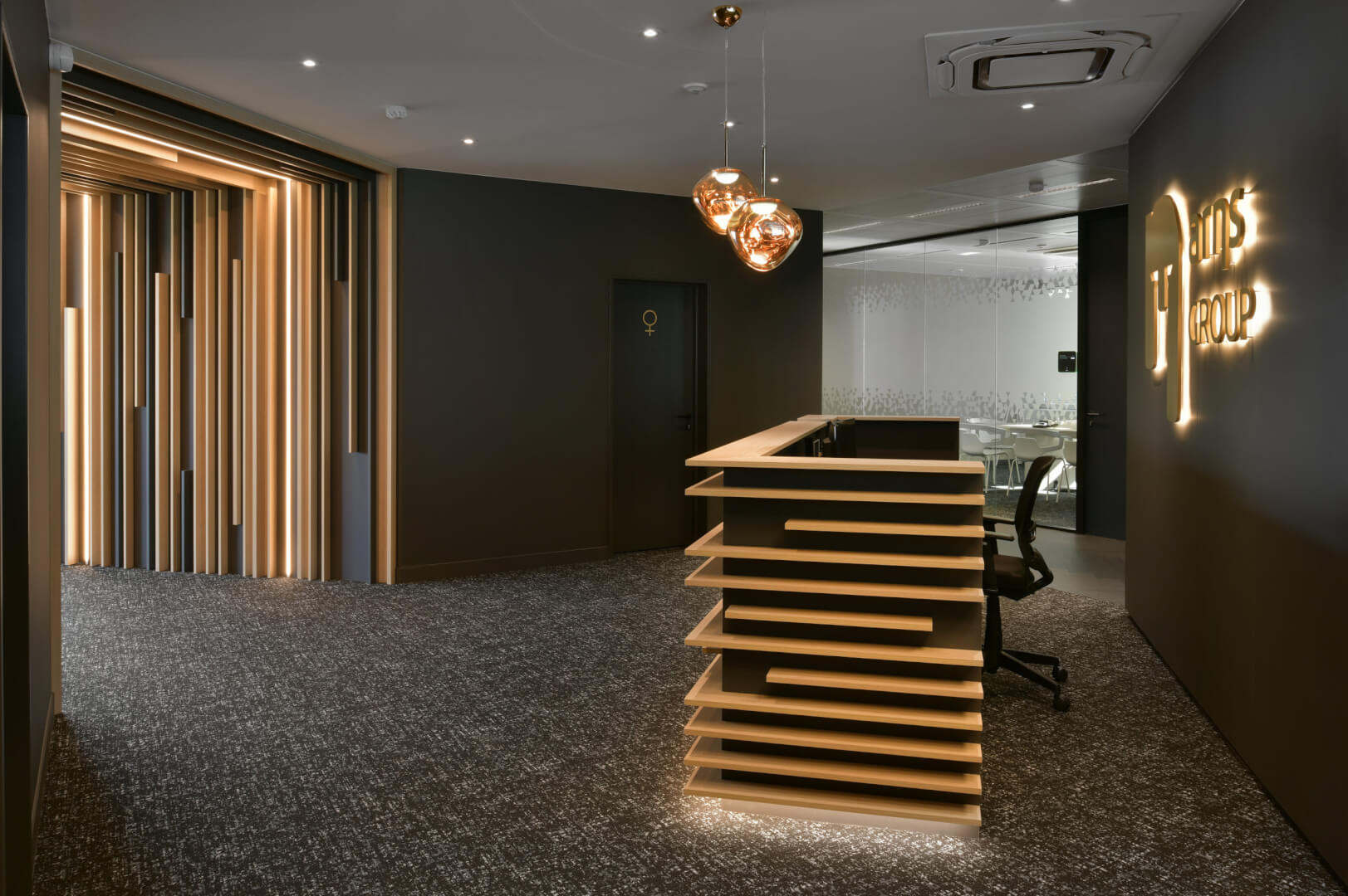 The integration of nature in the workplace is not a passing fad. Employees are keen on natural and sustainable elements. For the Arηs project, this is reflected in the strong green colour and the choice of wood for the reception desk and corridor. Both were custom-made thanks to the expertise of Alternativ.