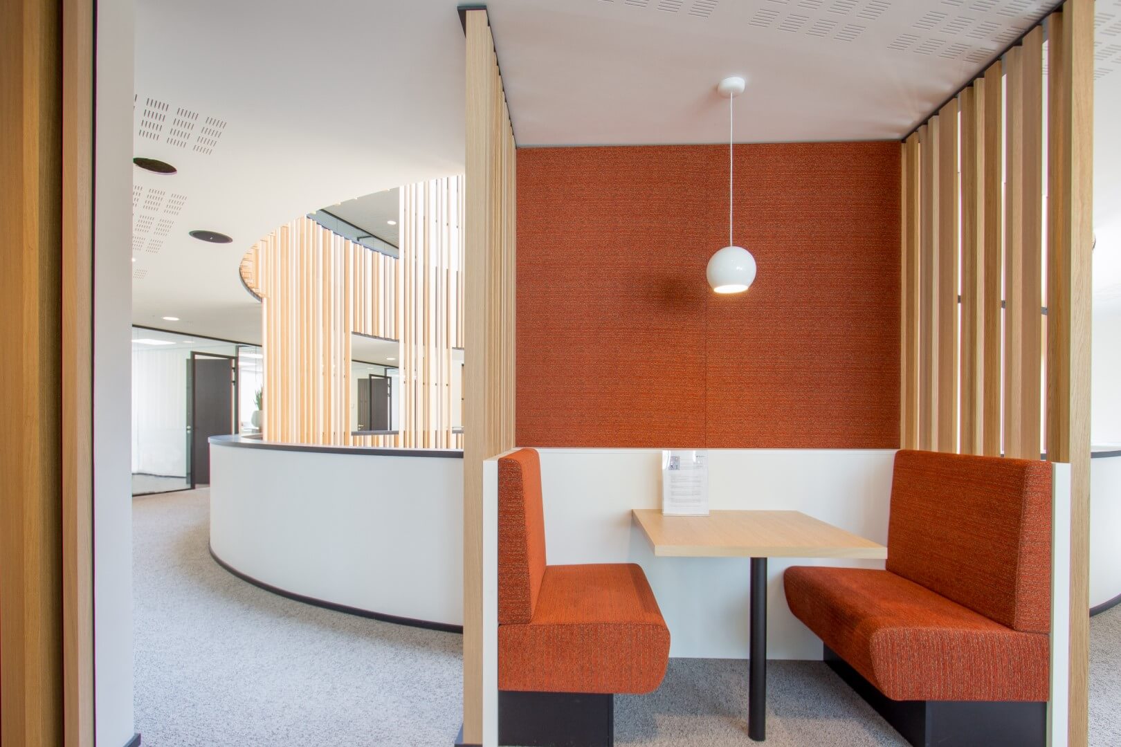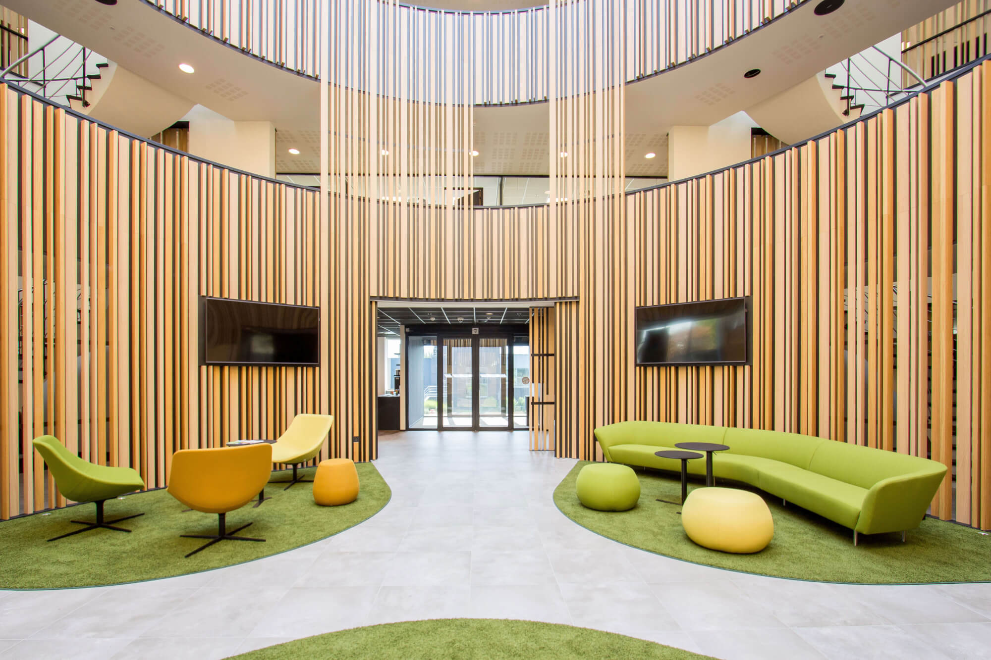Dit centrale element opent namelijk een perspectief op de twee verdiepingen van het gebouw, nodigt de blik uit om hoger te kijken, zichzelf te overstijgen en omsluit een loungehoek met scherm en een geïntegreerde bank in de vorm van een podium om een gezellige toets toe te voegen.