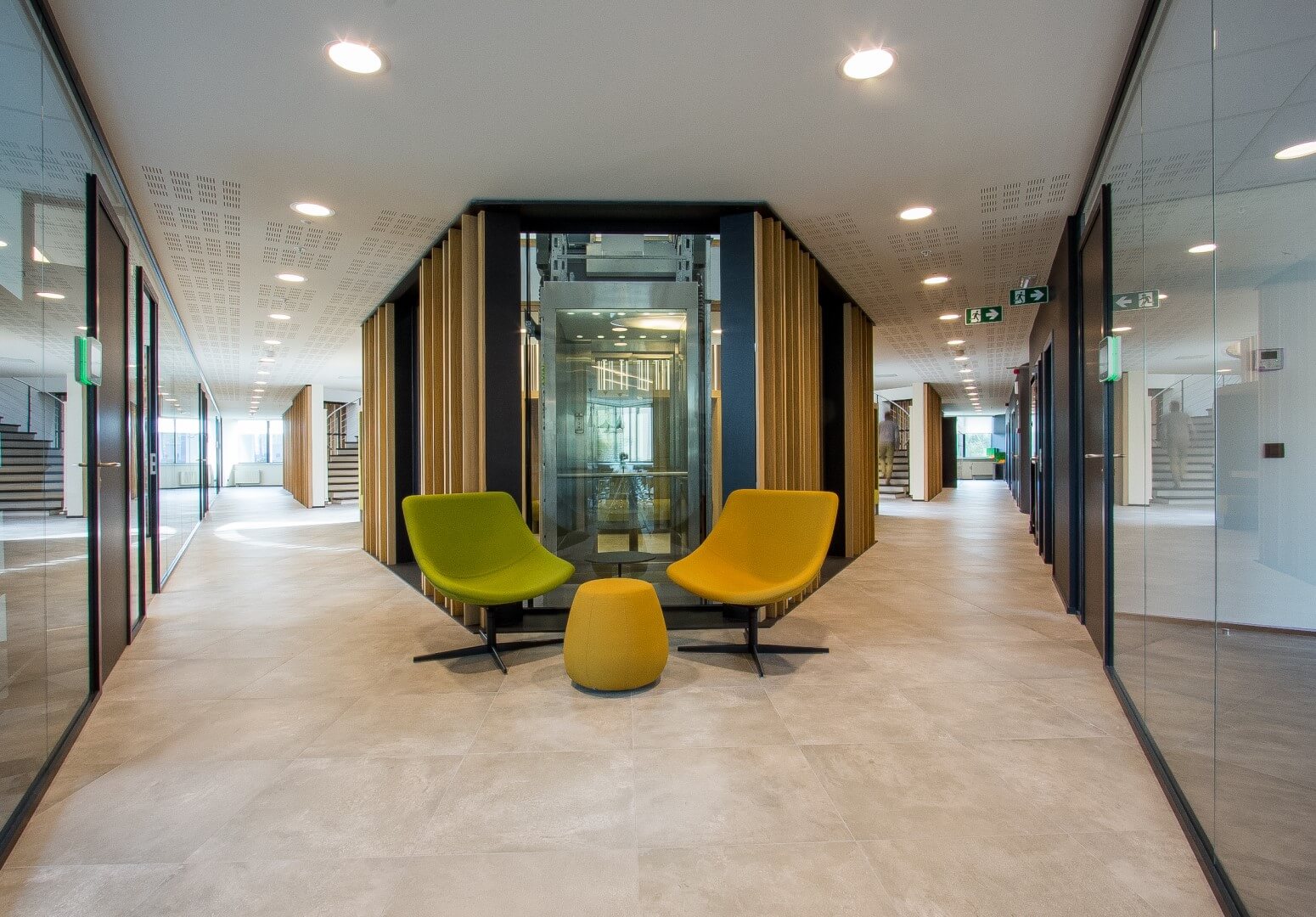 Het onthaal, dat het middengedeelte van de benedenverdieping in beslag nam, is een multifunctionele zone geworden met een loungehoek, ruimten met meer privacy en banken in de vorm van een podium voor groepspresentaties. Het overige gedeelte van de benedenverdieping kreeg een gezellig design, met een koffiehoek in brasseriestijl met stopcontacten en wifi, en een business center met verschillende vergaderzalen.