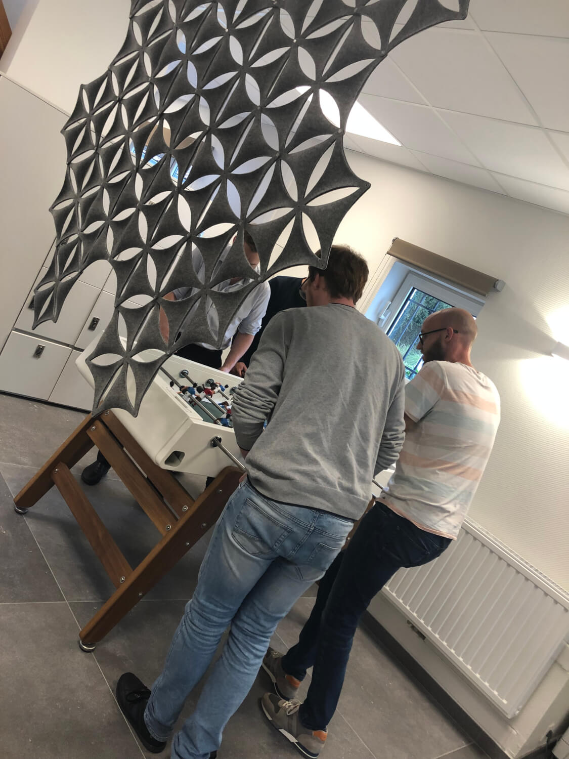 In het hoofdgebouw heeft Alternativ de beschikbare ruimte geoptimaliseerd (“we zijn van 14 naar 16 plaatsen gegaan”) en een tweede – meer intieme – vergaderzaal gecreëerd voor kleinere meetings met een beperkt aantal deelnemers. Het landschapskantoor werd behouden omdat dit een betere wisselwerking tussen de collega’s creëert, maar we hebben wel decoratieve akoestische panelen geplaatst om het geluid te dempen dat eigen is aan een open ruimte én we hebben een kickertafel voorzien om het wat gezelliger te maken voor de collega’s. Dit is met andere woorden “een globaal renovatieproject waarbij Alternativ al haar beloften is nagekomen (expertise, creativiteit en naleving van de deadlines) en dat ons heeft gerustgesteld in het idee dat er nog steeds zoiets bestaat als een goede service!”, zo concludeert Quentin Bolle, die zichtbaar tevreden is met zijn keuze voor Alternativ om zijn werkplaats in een nieuw jasje te steken.