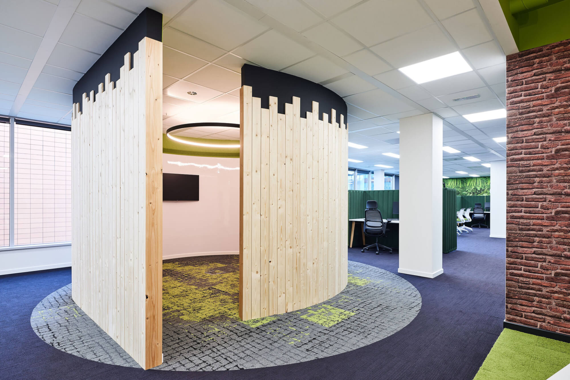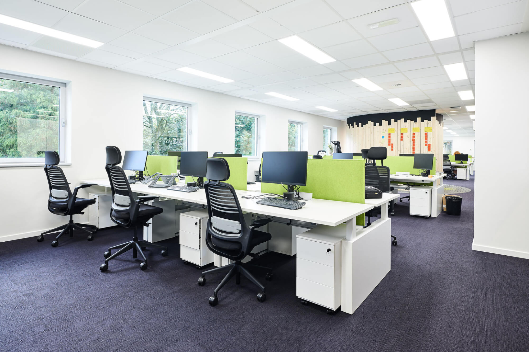 “Voor de eerste verdieping liet Alternativ zich sterk inspireren door biofiel design. Talrijke studies hebben immers aangetoond dat groene planten op kantoor bijdragen tot de productiviteitsgroei. Meer in het algemeen heeft groen een prominente plaats gekregen omdat deze kleur, die de natuur vertegenwoordigt, rustgevend is, zen en tegelijk de concentratie bevordert en energie geeft! De diverse tinten groen en de verschillende groene elementen (geschilderde tapijten, tapijten, meubels,… ) zorgen voor een gevarieerd effect.