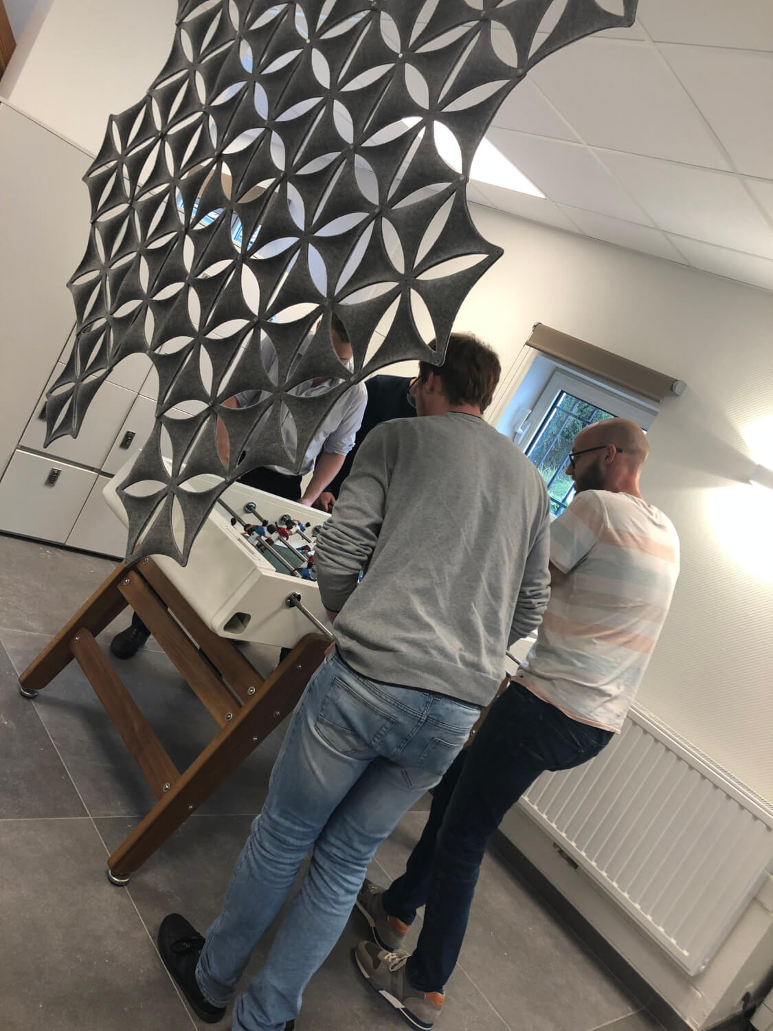 De fait, dans le bâtiment principal, Alternativ a optimisé l’espace (« nous sommes passés de 14 à 16 places »), créé une deuxième salle plus intime pour des réunions avec un petit nombre de participants, préservé le paysager qui invite à plus de réactivité entre les collaborateurs, placé des panneaux acoustiques décoratifs qui absorbent le bruit inhérent à ce paysager, installé un kicker pour renforcer les liens autour d’un moment convivial, etc. Soit « un projet de rénovation globale où Alternativ a tenu toutes ses promesses (expertise, créativité et respect des délais de chantier) et qui nous a confortée dans l’idée que oui, la notion de service existe toujours ! », conclut Quentin Bolle visiblement heureux d’avoir choisi Alternativ, pour repenser son lieu de travail.