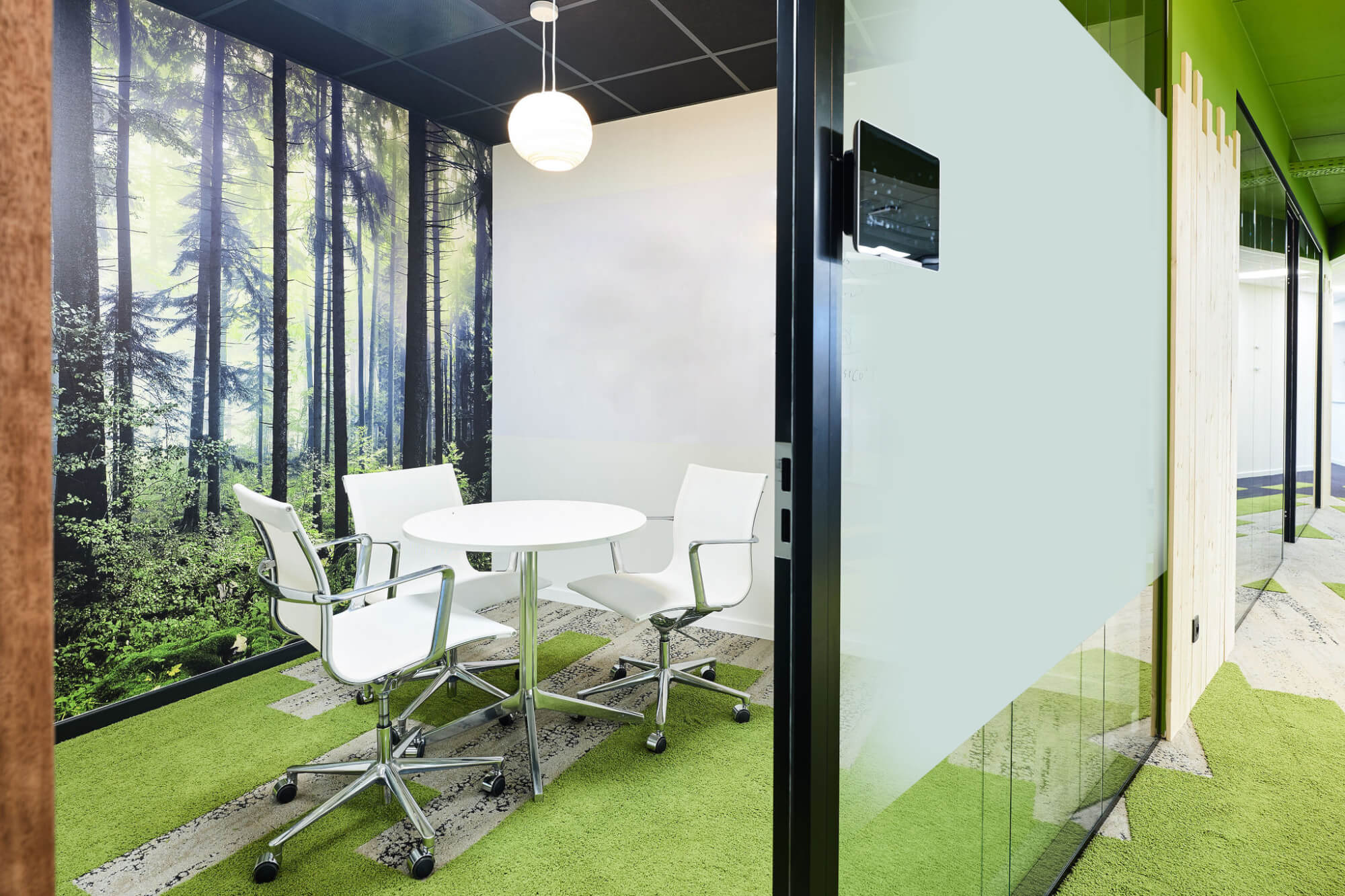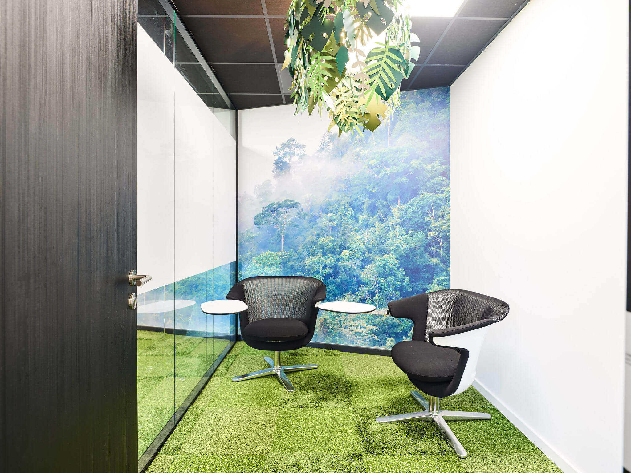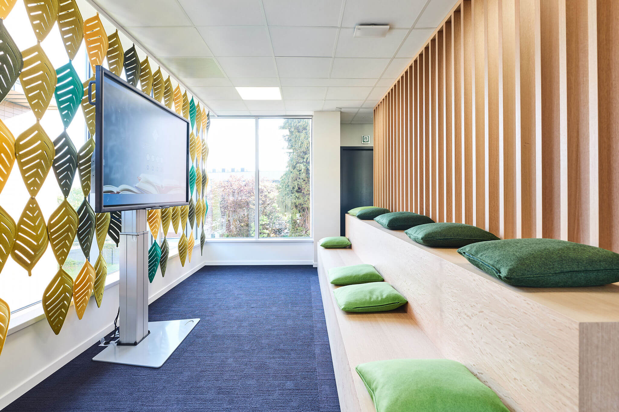 « Au premier étage, Alternativ s’est fortement inspiré du design biophilique. De nombreuses études ont en effet prouvé l’incidence de la présence des plantes vertes au bureau sur l’accroissement de la productivité. Plus généralement, on a mis le vert à l’honneur, car cette couleur qui représente la nature est apaisante, zen, propice à la concentration, et tonifiante à la fois ! Un vert que l’on a décliné dans de multiples tonalités et supports (tapis peints, moquette, mobiliers, etc.) pour varier les effets.