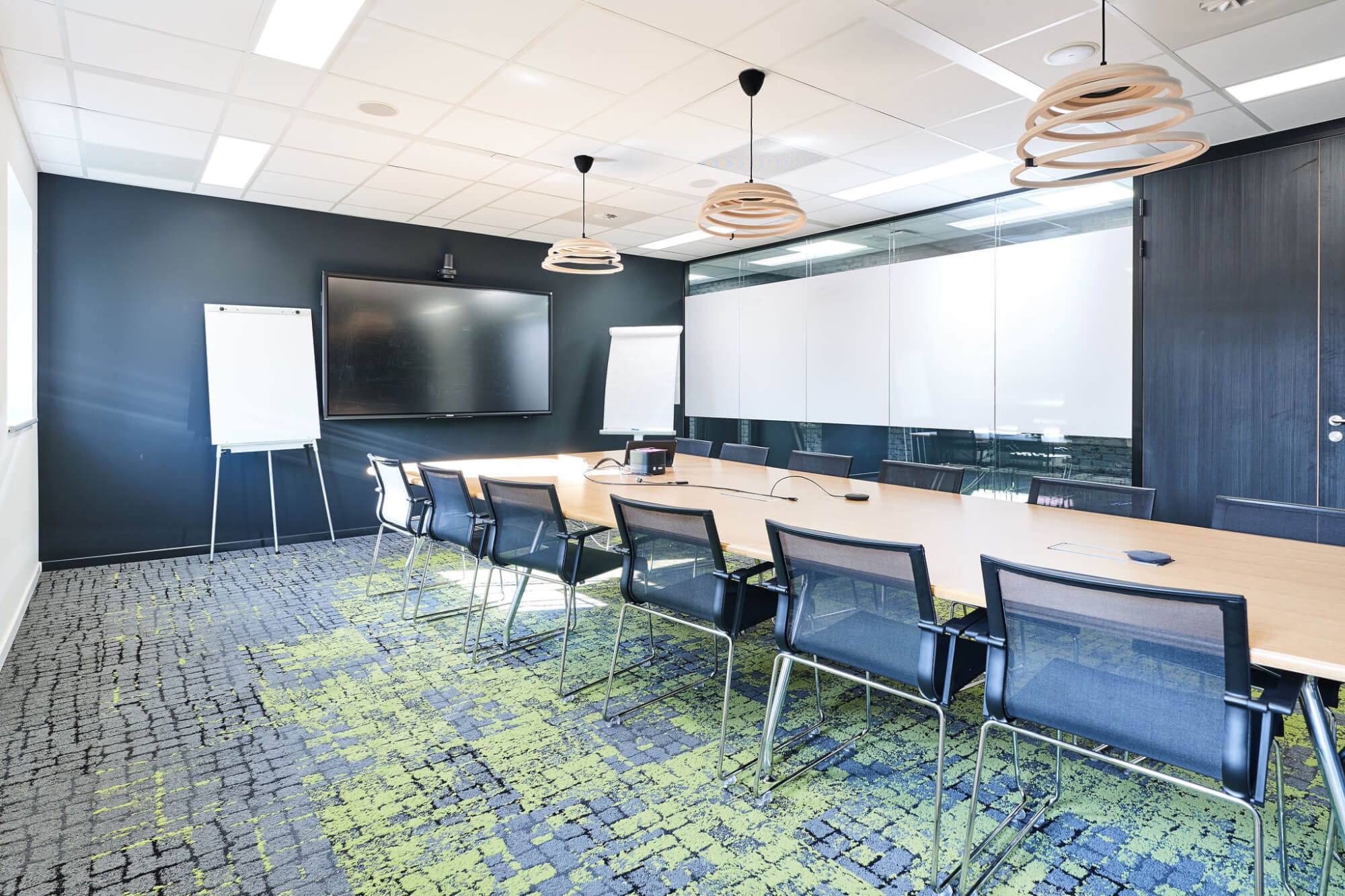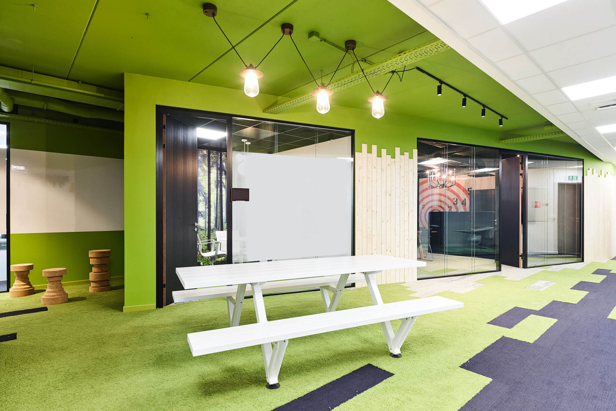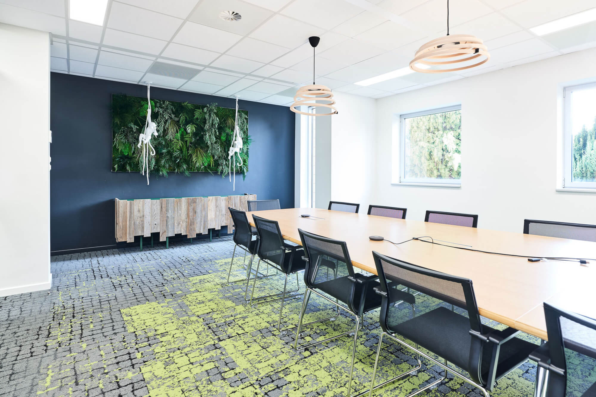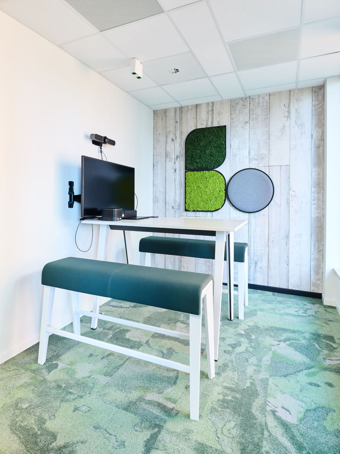 « Au premier étage, Alternativ s’est fortement inspiré du design biophilique. De nombreuses études ont en effet prouvé l’incidence de la présence des plantes vertes au bureau sur l’accroissement de la productivité. Plus généralement, on a mis le vert à l’honneur, car cette couleur qui représente la nature est apaisante, zen, propice à la concentration, et tonifiante à la fois ! Un vert que l’on a décliné dans de multiples tonalités et supports (tapis peints, moquette, mobiliers, etc.) pour varier les effets.